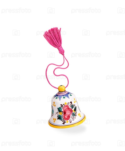 Туристический сувенир: керамический колокол с традиционным цветочным орнаментом, изолированный на белом фоне