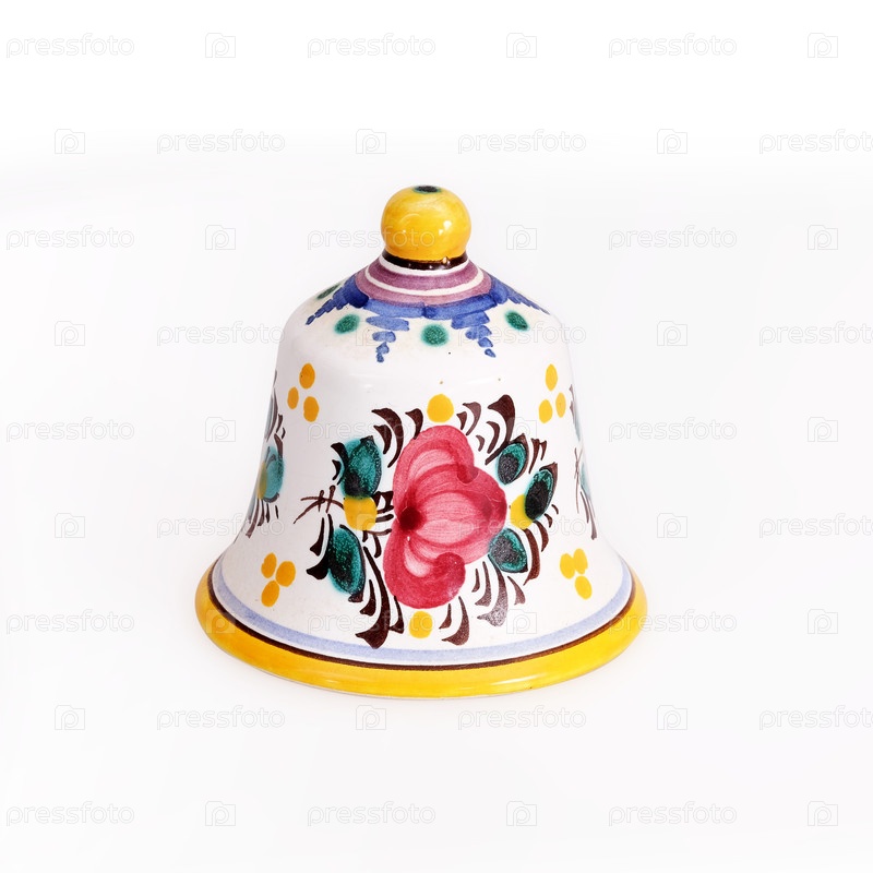 Туристический сувенир: керамический колокол с традиционным цветочным орнаментом, изолированный на белом фоне
