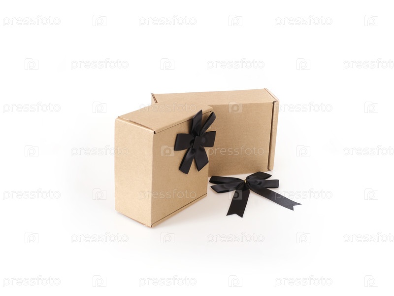 Две коробки с черными луками и лентой, изолированные на белом фоне