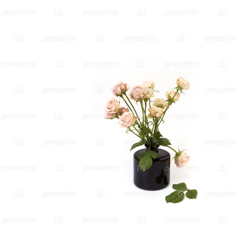 Белые розы в черной вазе, выделенные на белом фоне