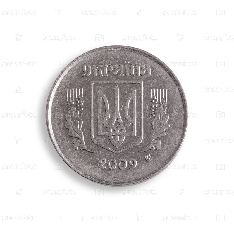 Украинская монета 5 копеек выделена на белом фоне. Надпись означает 'Украина'