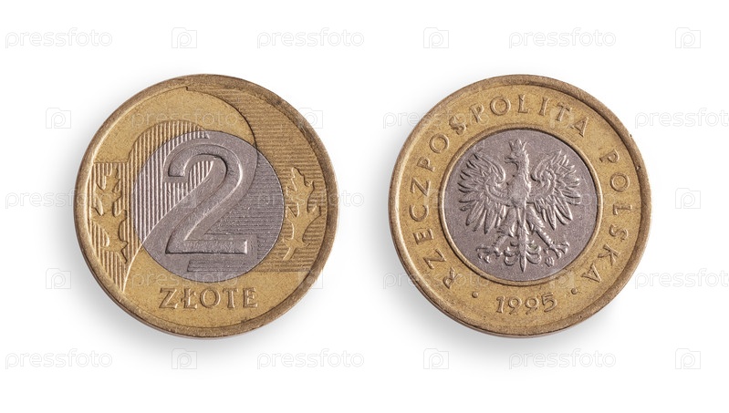 Польская монета 2 злотых (обратная и обратная). польская надпись 'Polish Lithuanian Commonwealth of Poland' на английском языке. элемент дизайна с подрезанной дорожкой