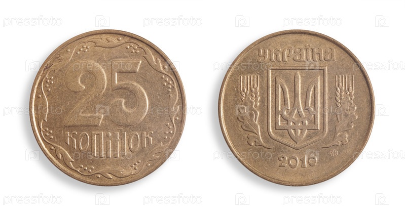 Украинская монета номиналом 25 копеек выделена на белом фоне (обратно и обратно). Надпись означает '25 копеек'. Украина. Элемент дизайна с обрезанной дорожкой