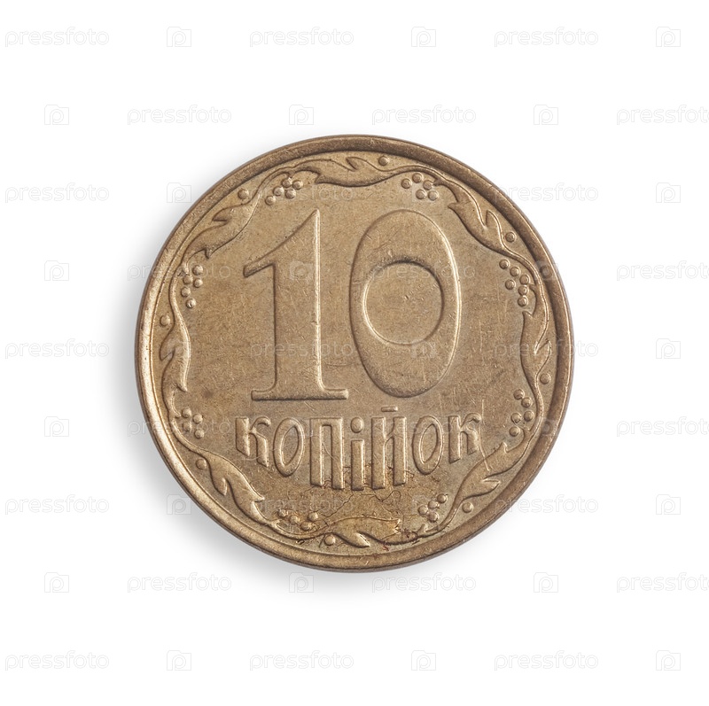 Украинская монета 10 копеек выделена на белом фоне. Надпись означает '10 копеек'