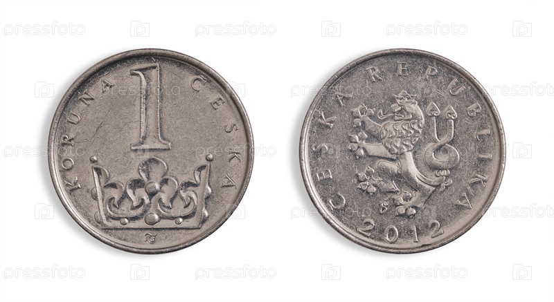 Монета чешской 1 кроны (обратная и обратная сторона).Чешская надпись '1 коруна'. Чешская Республика' на английском языке.Элемент дизайна с обрезанной дорожкой