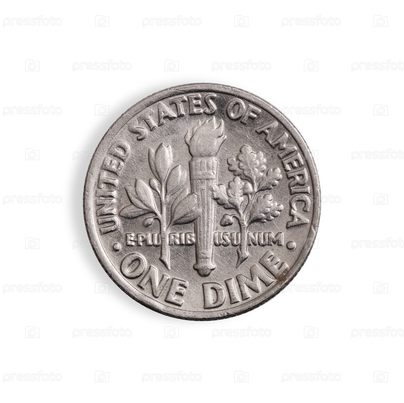 10-центовая монета США, выделенная на белом фоне.Латинский девиз в английском языке означает 'one from many'