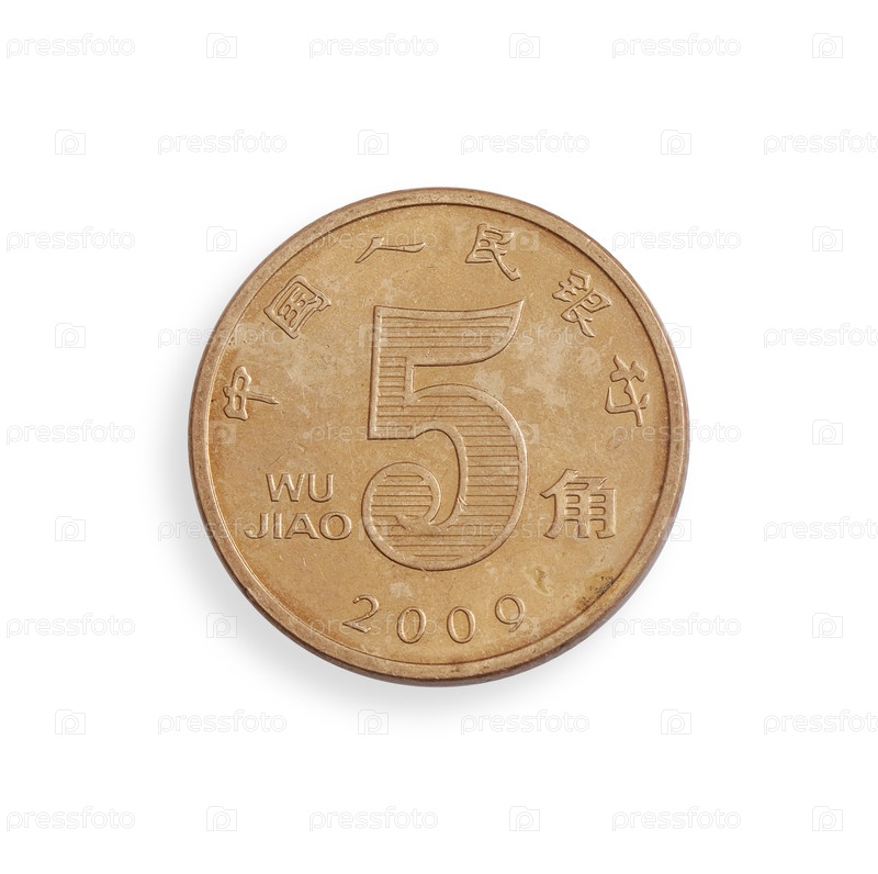 Монета китайского пятицзяо имеет две стороны, изолированные на белом фоне. Китайская надпись означает 5 цзяо. Народный банк Китая по-английски. Элемент дизайна с подстриженной дорожкой