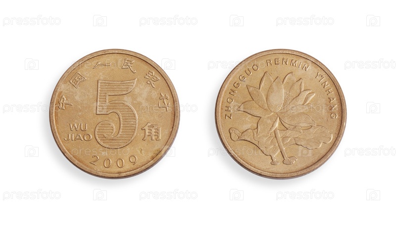 Монета китайского пятицзяо имеет две стороны, изолированные на белом фоне. Китайская надпись означает 5 цзяо. Народный банк Китая по-английски. Элемент дизайна с подстриженной дорожкой