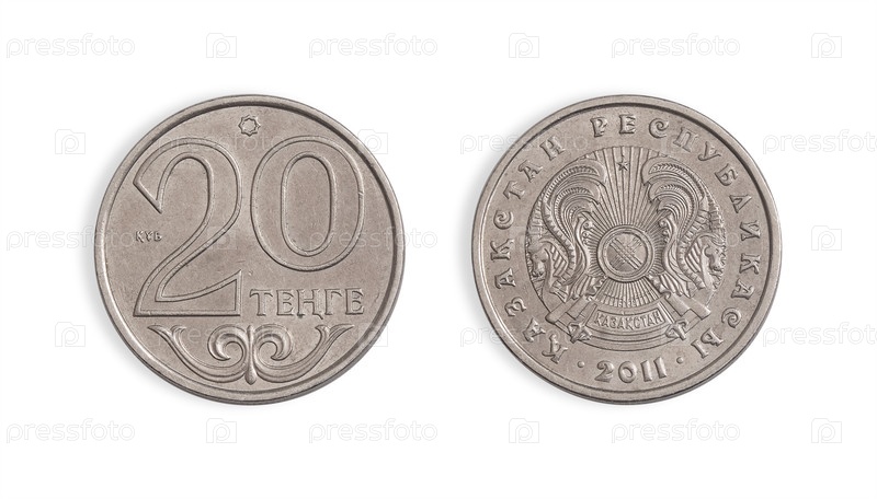 Казахская монета 20 тенге (обратная и обратная сторона). казахская надпись означает 'Республика Казахстан' на английском языке. элемент дизайна с обрезанной дорожкой