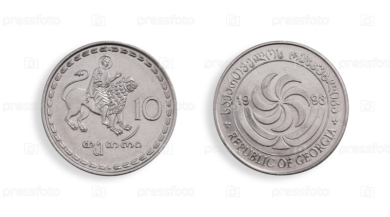 Грузинская монета 10 тетри (обратно и обратно).Грузинская надпись на английском языке означает Республика Грузия.10 тетрис.Элемент дизайна с подрезанной дорожкой