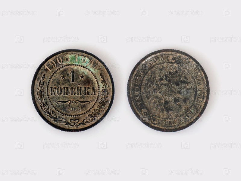 Древняя российская монета в один пенни расположена на белом фоне.Русская надпись означает copper Russian coin in a penny по-английски