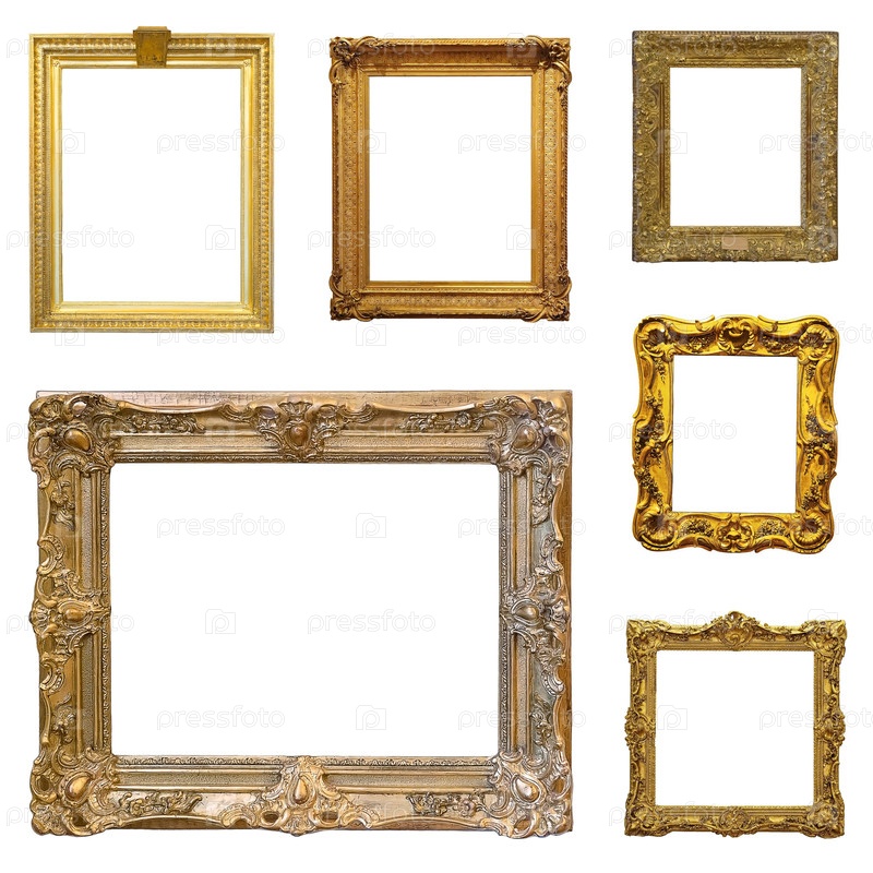 Золотые рамы для картин, зеркал или фотографий, изолированных на белом фоне (множество изображений)