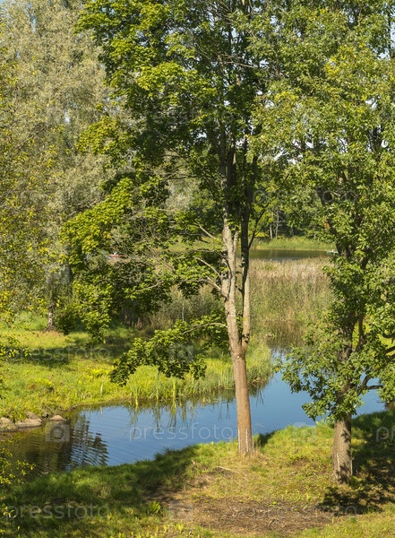 Летний пейзаж в старом парке с небольшой рекой
