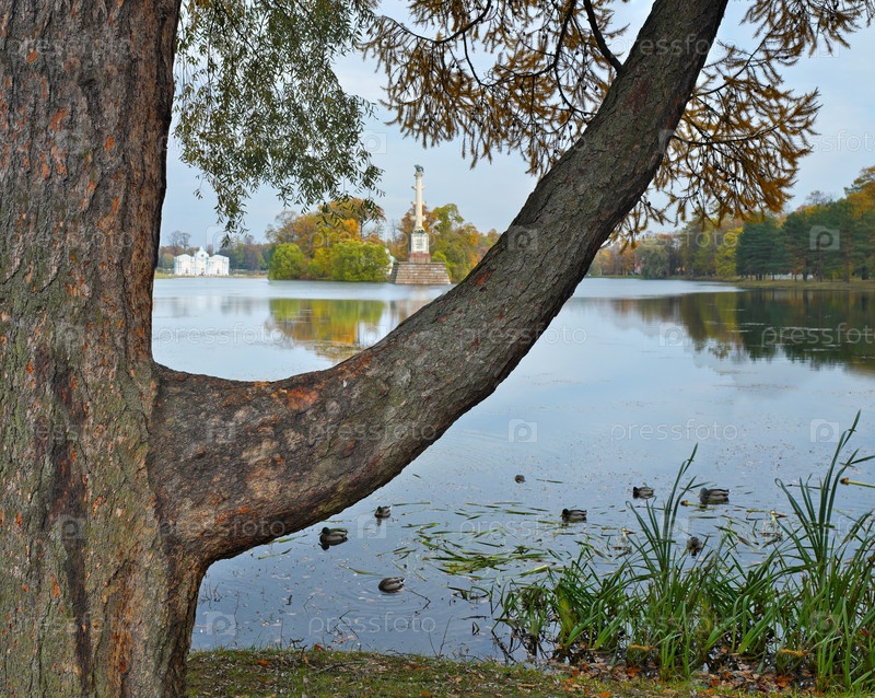 Колонна Чесме в большом пруду осенью, дворцовый комплекс Царское Село возле Санкт-Петербурга, Россия