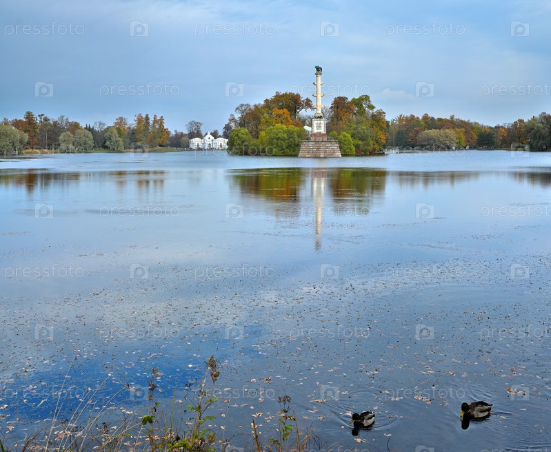Колонна Чесме в большом пруду осенью, дворцовый комплекс Царское Село возле Санкт-Петербурга, Россия