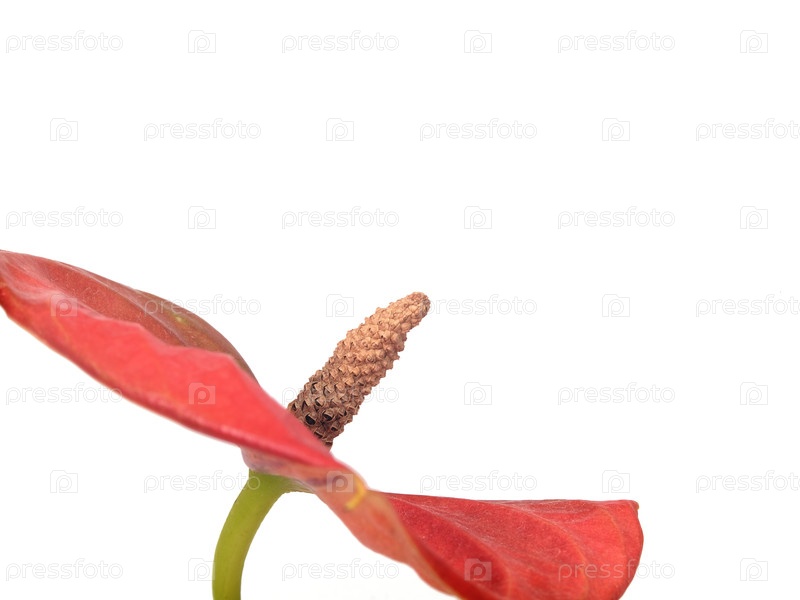 Экстремальный крупный план красного цветка антурии с изолированным пистом на белом фоне, чрезвычайно высокое разрешение