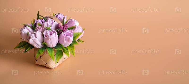 Шаблон приветственной карточки.Тюльпановая корзина изолирована на оранжевом фоне