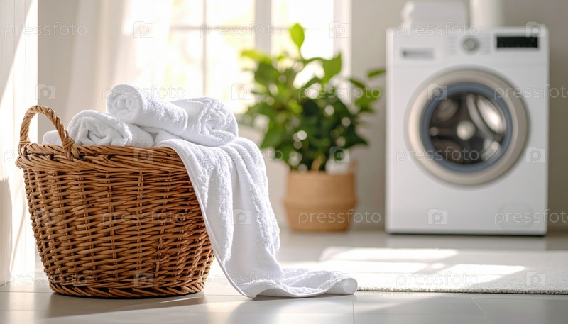 Яркое белье с чистыми белыми полотенцами символизирует домашний порядок, гигиену, ежедневный уход и обслуживание в повседневной современной жизни
