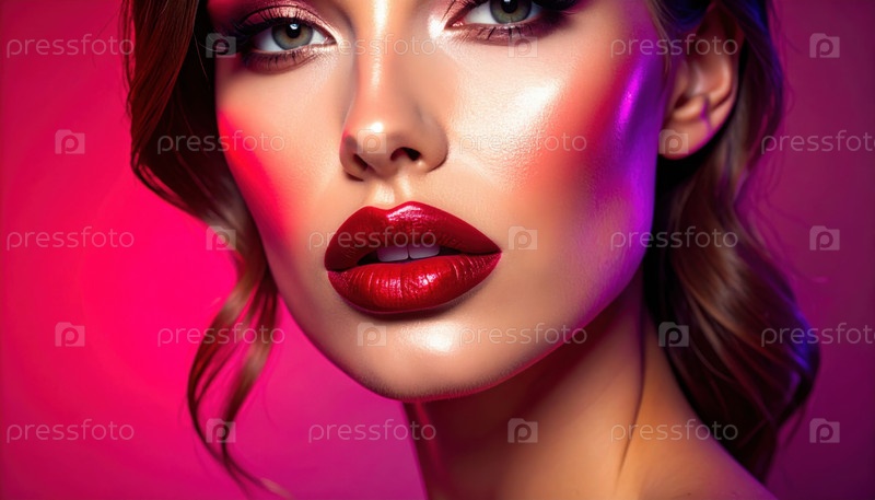 Стилизированная женщина с блестящими красными губами и ярким макияжем, отражающими тенденции в области красоты, модные статьи и современную косметику в стиле цифрового искусства