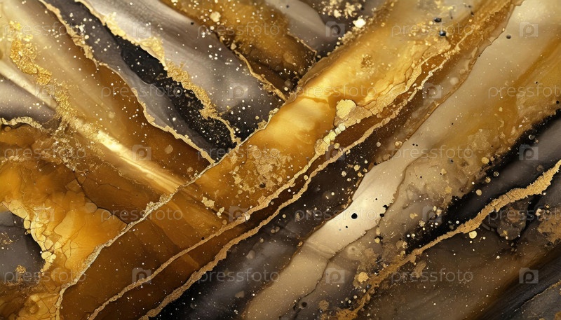 Абстрактное жидкое искусство в черном, золотом и бронзовом цветах со сверкающими текстурами передает современную роскошь, художественное творчество и органическое движение энергии или богатства