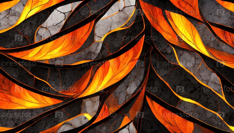 Абстрактное изображение светящихся оранжевых и красных листьев лавы, сливающихся с темным фоном скалы, представляющих поток энергии и слияние природы