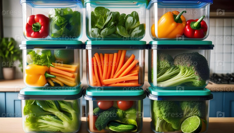 Организованные контейнеры, заполненные красочным разнообразием свежих овощей, аккуратно расположены на кухонном столе для приготовления пищи