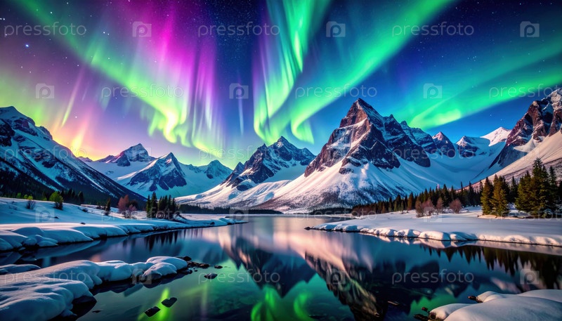 Красочные огни северного сияния танцуют над заснеженными горными вершинами и зеркальным озером, захватывая восхищение природными явлениями и исследованием Арктики