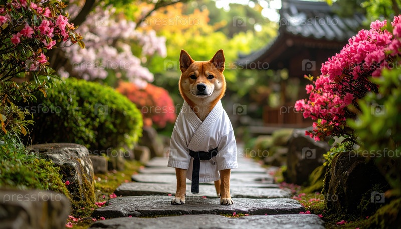 Шиба Ину в форме боевых искусств стоит в дзен-саду, отражая слияние традиции и современной культуры домашних животных в Японии