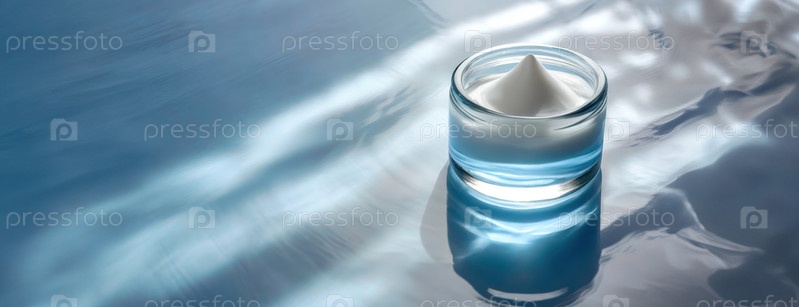 Увлажняющий крем в стеклянной банке отражается на поверхности воды, передавая чистоту.Уход за кожей необходим с акцентом на гидратацию и чистую красоту продукта