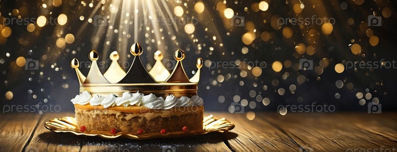 Торт Епифании с золотой короной праздничный золотистый боке фон с копировальным пространством зимние каникулы панорама