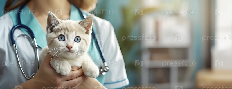 Котенок держит человека в медицинской одежде с размытым фоном. Медицинское обслуживание животных в ветеринарной клинике. Панорама с копировальным пространством