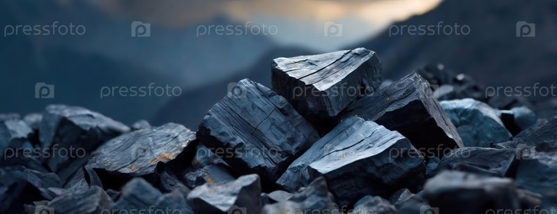 Уголь накапливается, намекая на ископаемое топливо и энергию. богатые углеродом месторождения расположены посреди сумерек, намекая на добычу полезных ископаемых и энергетику. панорама с копировальным пространством