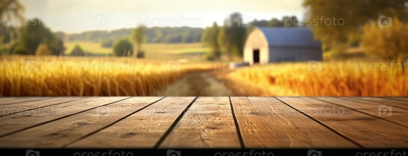 Деревянная поверхность с живописным сельским фоном, структура фермы видна.Рустикные доски простираются с видом на золотые поля, дальний сарай, ясный день