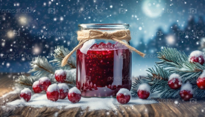 Банка ярко-красного варенья с клюковиной, украшенная деревенскими близнецами, в окружении клюквы и сосновых ветвей в снежной зимней сцене под ясным ночным небом с полнолунием