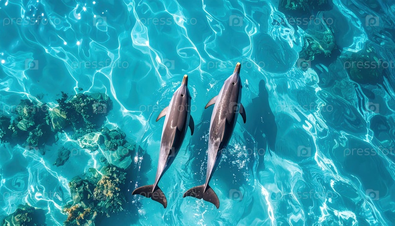 Вид с воздуха двух дельфинов, плавающих в кристально чистой воде, предполагающий мир, гармонию природы и морской дикой природы в тропических направлениях