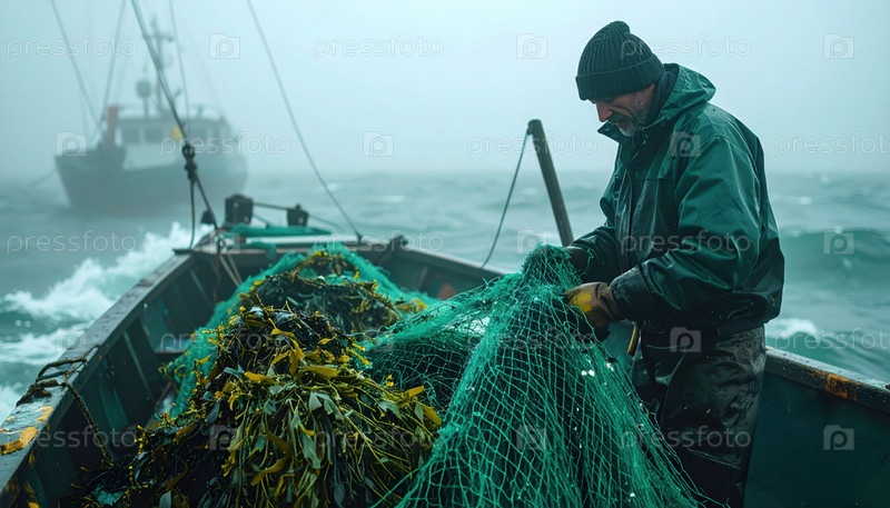 Рыбак вытаскивает водоросли из рыболовной сети на лодке во время туманной погоды в открытом океане