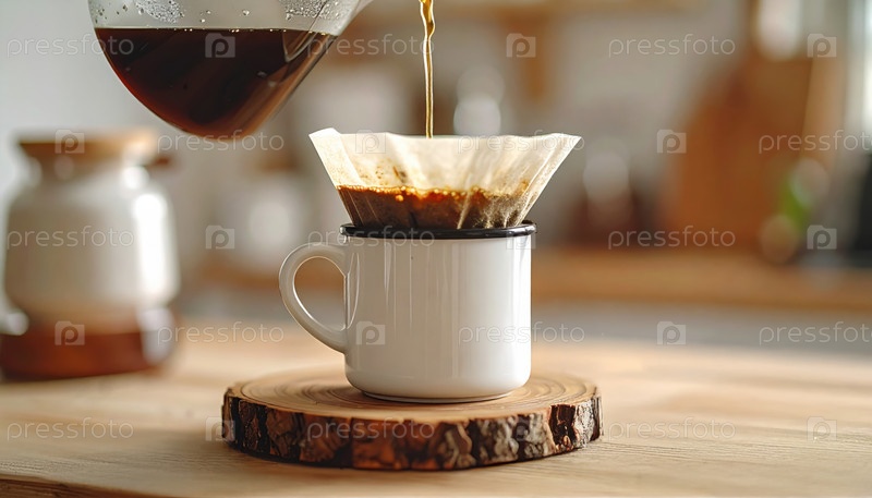 Процесс заваривания кофе на деревенской кухне, захватывающий тенденцию медленной жизни, напитки ручной работы и уютные утренние ритуалы с природными элементами