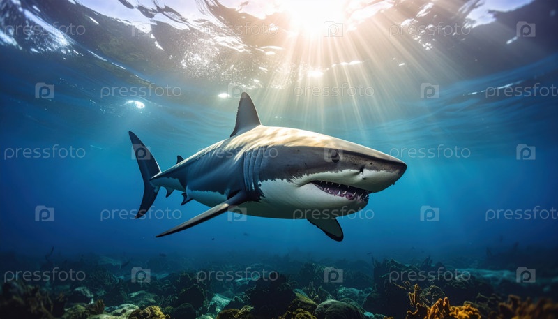 Большая белая акула плавает вблизи океанического дна с лучами света, символизирующими морскую жизнь, морских хищников и подводных исследований