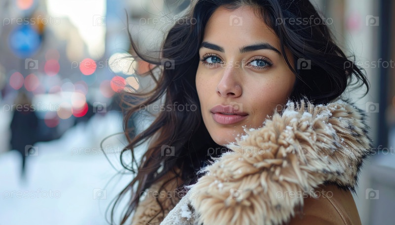Женщина в меховом пальто на снежном городском улице воплощает зимнюю моду, городской образ жизни и личное тепло среди холодного окружения