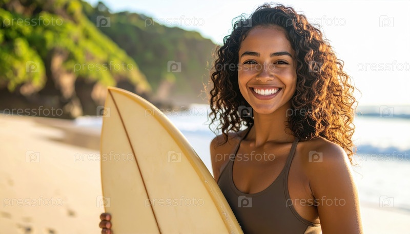 Счастливая женщина, держащая доску для серфинга на солнечном пляже, представляет собой летние каникулы, культуру сёрфа и радостный образ жизни