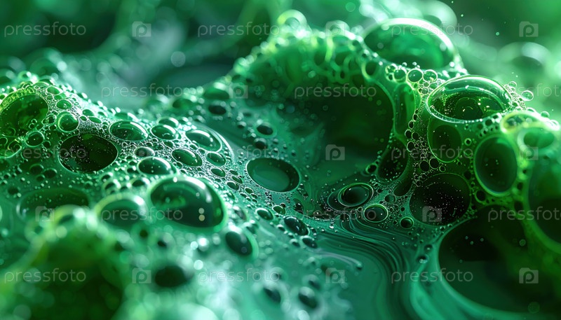 Абстрактная структура из зеленой пены, включающая микроскопические биологические или химические реакции в лаборатории или научно-фантастической среде