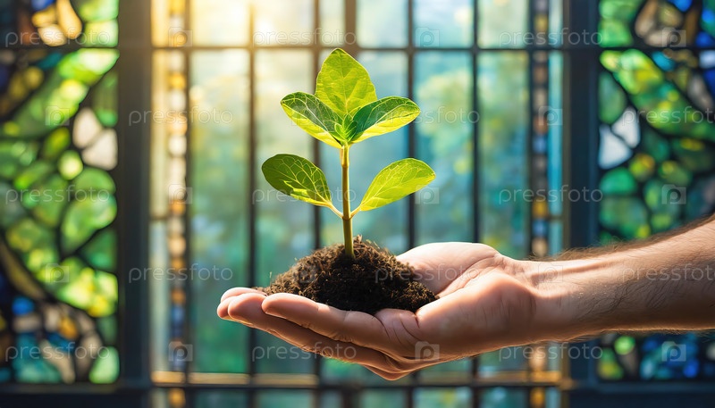 Молодой рост растения, который он держал в руках на фоне красочного витража с солнечным светом