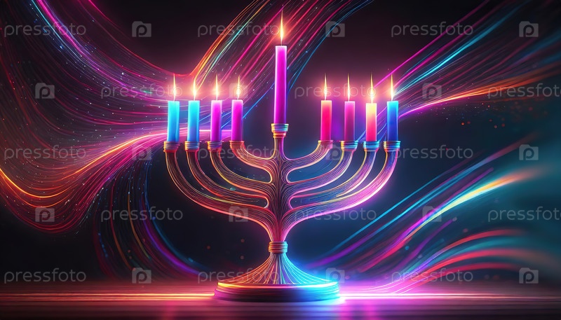 Светящаяся менора с яркими неоновыми свечами на темном фоне с вращающимися огнями