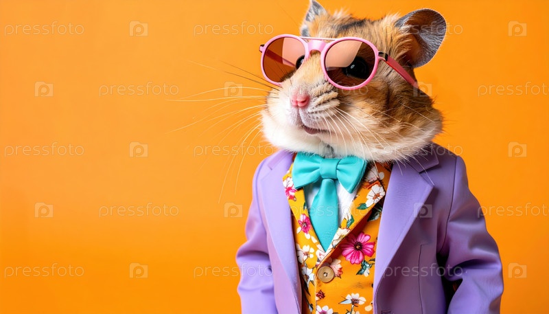 Стилизованный антропоморфный хомяк в цветочном костюме и солнцезащитных очках, представляющий игрушную моду, сюрреалистический юмор или творческие рекламные концепции