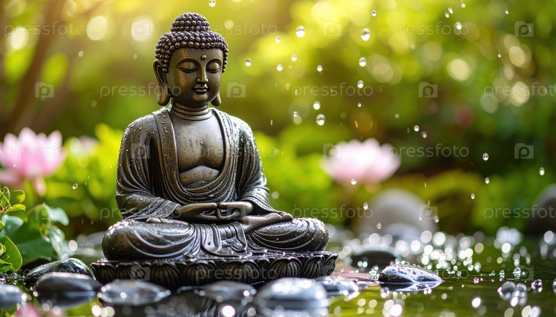 Статуя Будды в Дзен-саду окружена капельками воды и цветами лотоса, представляющими духовное пробуждение, медитацию и мирную естественную гармонию