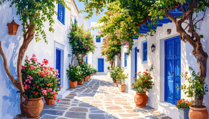 Очаровательная греческая островная переулок с белобелыми зданиями и синими дверями, идеально подходит для средиземноморских тем отдыха, прибрежной культуры и романтических летних побегов