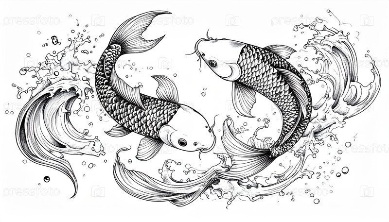Две сложные рыбки-кои плавают среди стилизованных волн, представляя гармонию, поток и художественное выражение в стиле монохромного чернил
