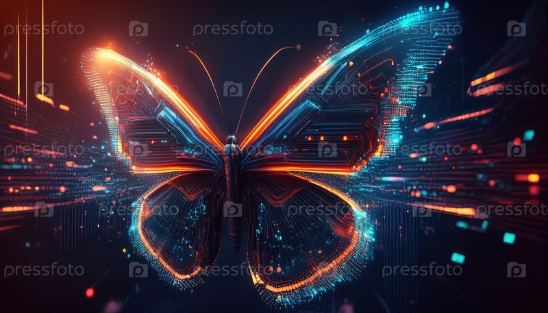 Цифровая бабочка состоит из схематических узоров и светящихся крыльев, представляющих трансформацию, эволюцию технологий и дизайн искусственного интеллекта