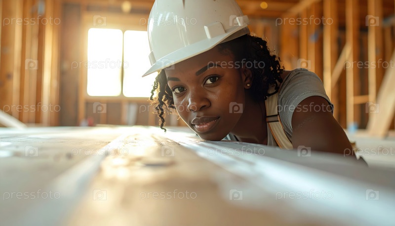 Строитель изучает деревянную конструкцию на строительной площадке с солнечным фоном