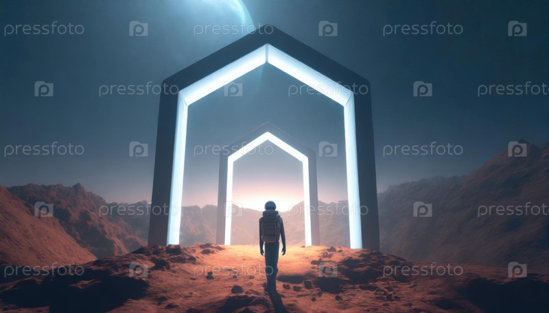 Астронавт, стоящий на скалистом инопланетном ландшафте, встречает светящиеся футуристические арки под обширным космическим небом, символизирующим исследование космоса и тайну